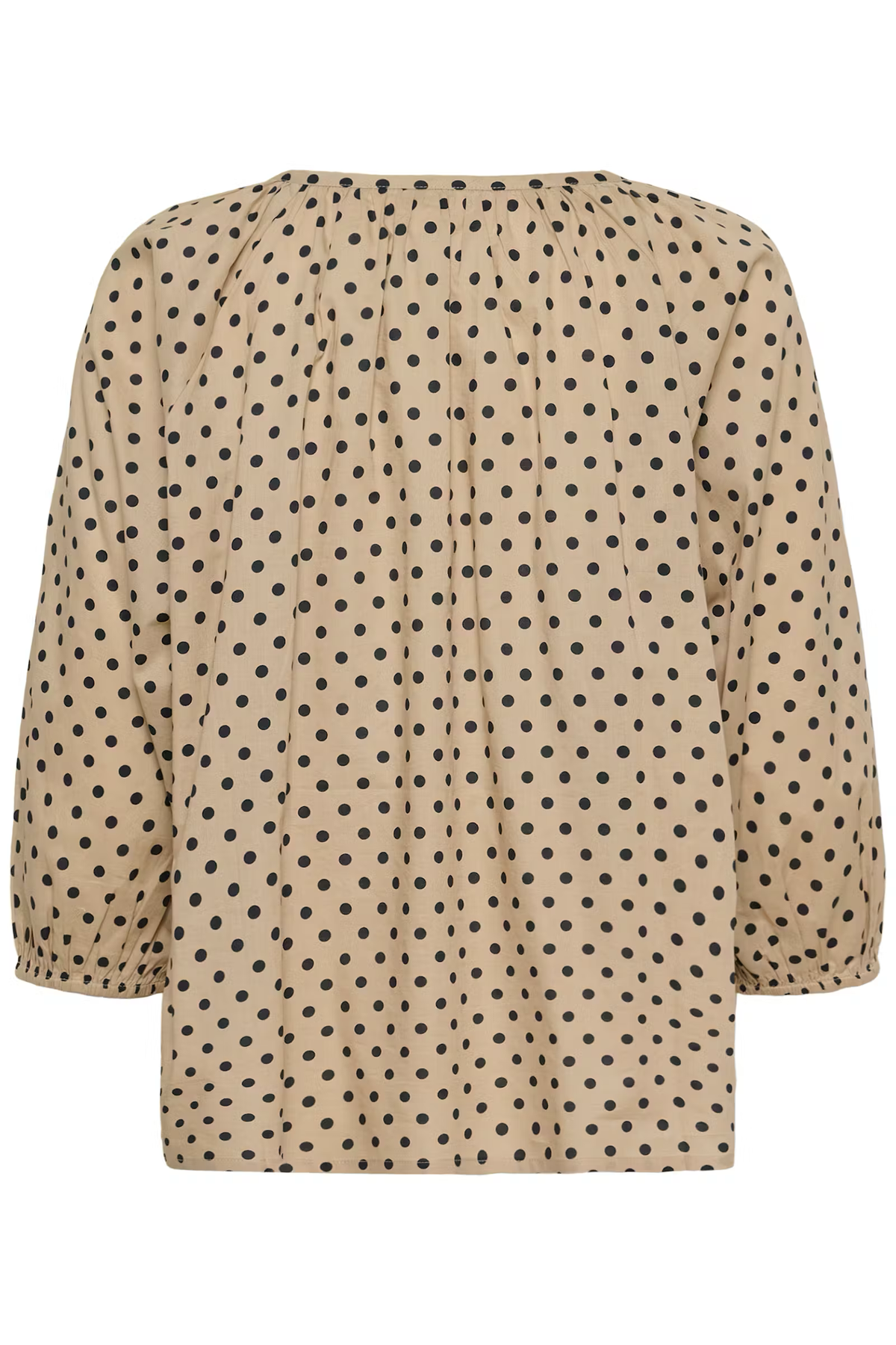 Blouse with a loose silhouette, round neckline and cropped sleeves. Features full button front, gentle gathers and a smooth, airy texture
