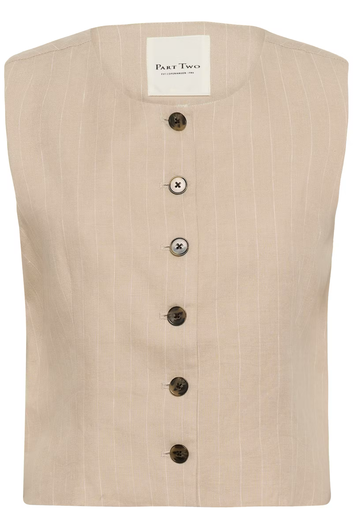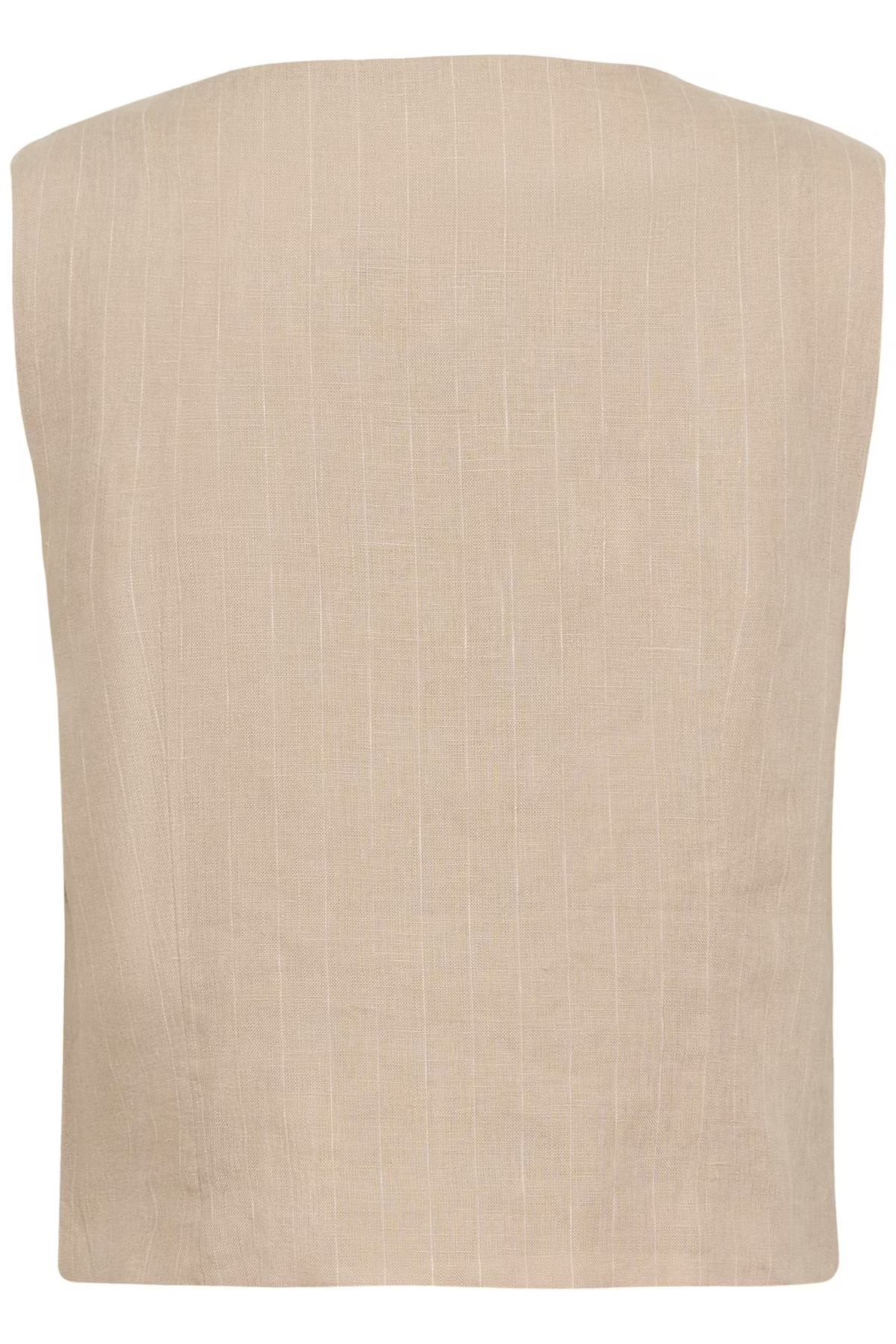 Pinstripe vest features a straight fit, classic round neckline and front button closure. Sleeveless design with a slightly cropped length creates a sharp, modern silhouette