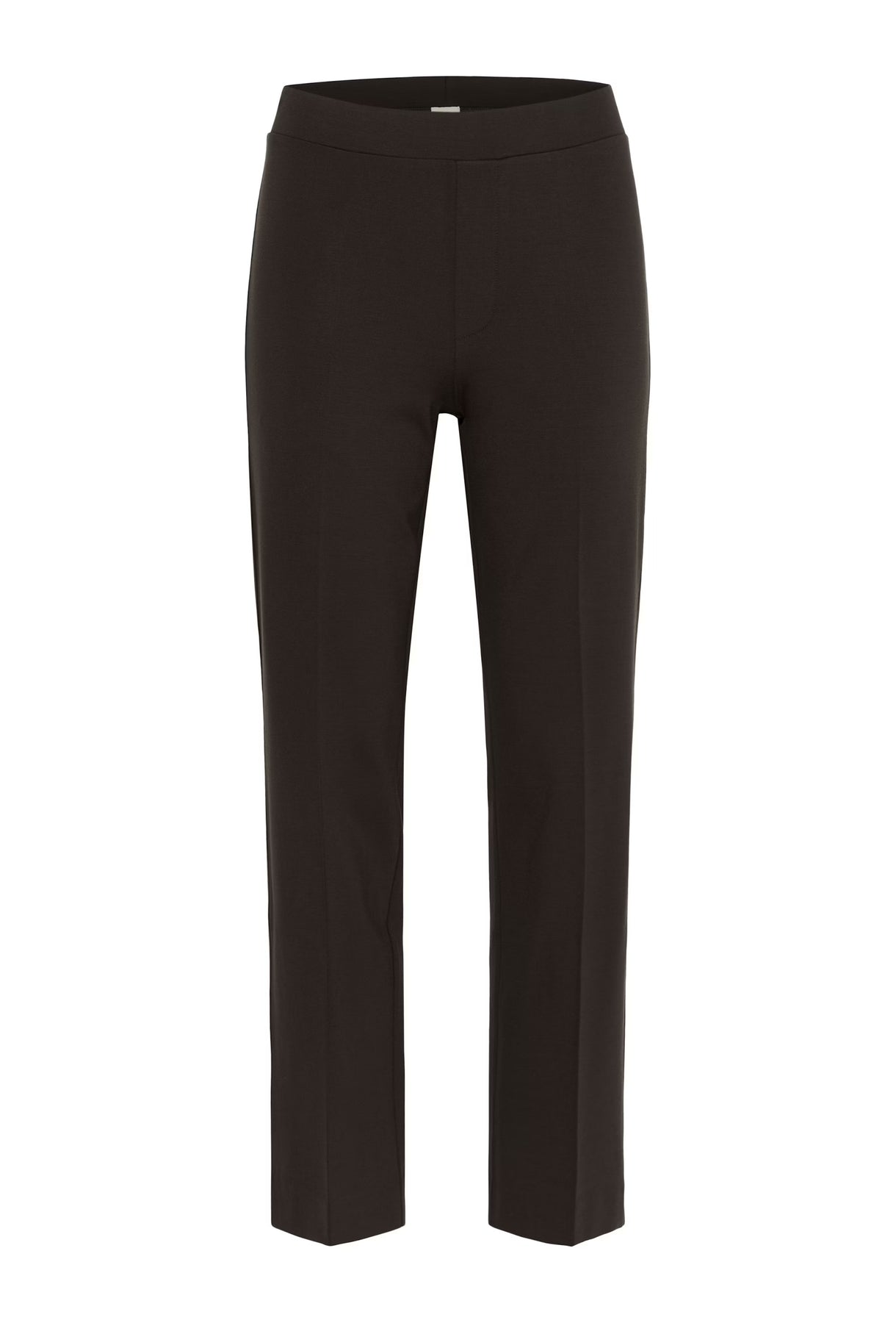 The model is 176 cm tall and wears a size 36. These elegant trousers in a dark brown shade feature a flattering straight-leg fit with pressed creases and a slight stretch for all-day comfort. The discreet back pockets and minimalistic design make them ideal for both office wear and casual days. Style them with a simple top or a blazer for a complete look.