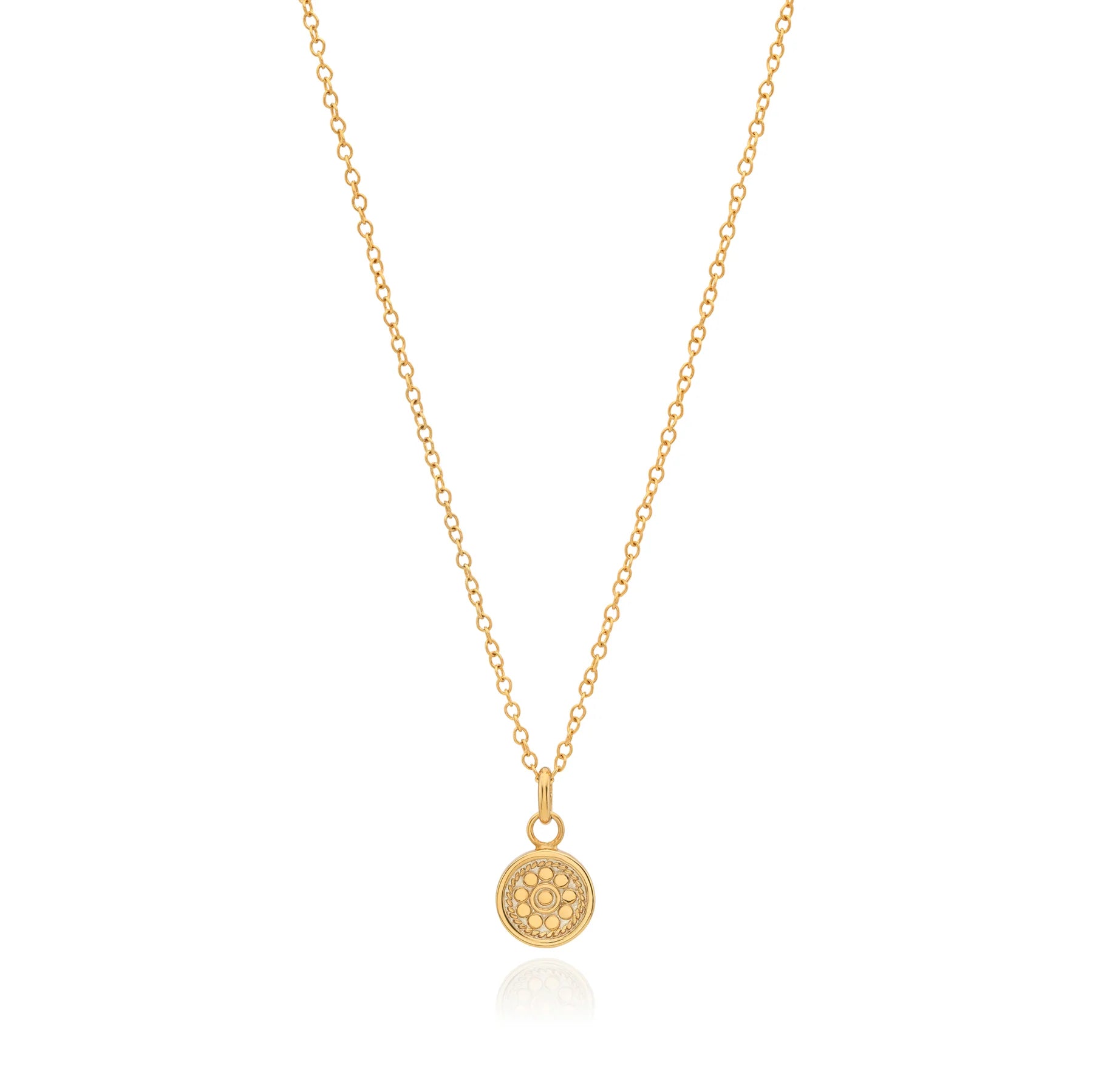 With simple styling and delicate detailing, this Artista Small Circle Pendant from Anna Beck is a jewellery box staple, perfect for everyday wear. Handcrafted in Bali in sterling silver with an 18ct gold vermeil, each dot has been placed carefully by hand in a beautiful floral motif. Pendant diameter: 10.5mm. Chain Length: 16-18" adjustable. Presented in official Anna Beck packaging.