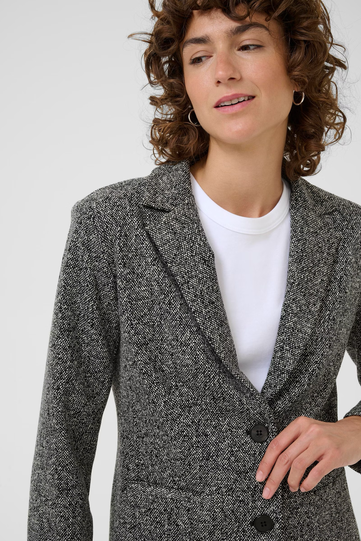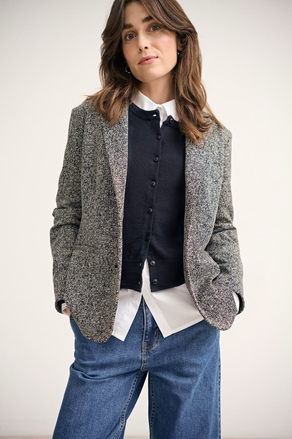 The model is 178 cm tall and wears a size 36. This classic blazer in a beautiful wool blend features a flattering fit and timeless design. The structured shoulders and tailored cut create an elegant look, perfect for both the office and everyday wear. Style it with matching trousers or jeans for a sophisticated outfit